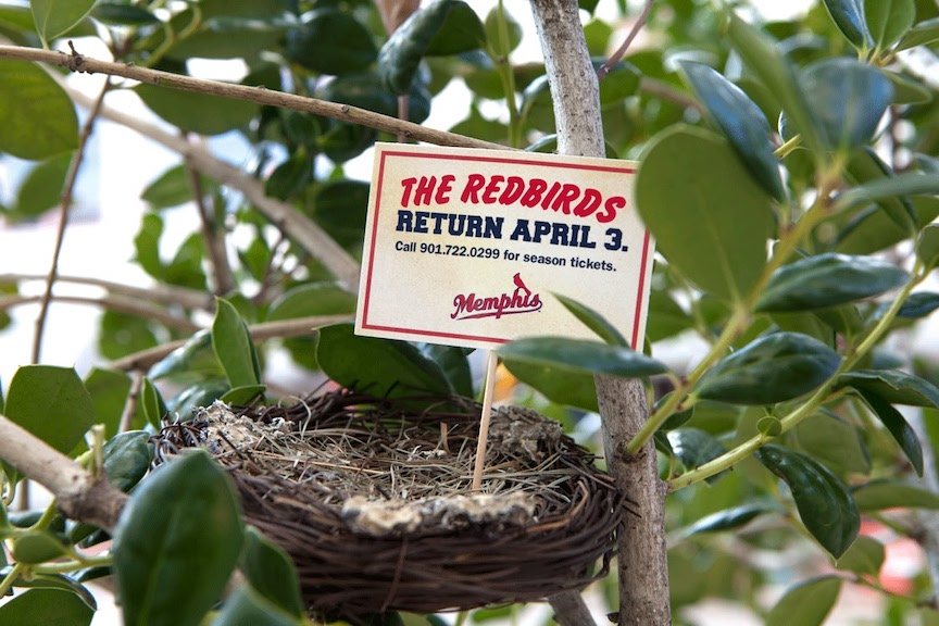 Birds nests placed downtown to promote season tickets with message: “The Redbirds return April 3.”